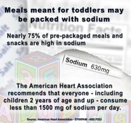 A product was defined as high in sodium if it had more than 210 mg of sodium per serving. Toddler meals had significantly higher amounts of sodium than baby meals, and the amount of sodium in some of the toddler meals was as high as 630 mg per serving – about 40 percent of the 1,500 mg daily limit recommended by the American Heart Association. The foods with the most sodium were savory snacks and meals for toddlers.